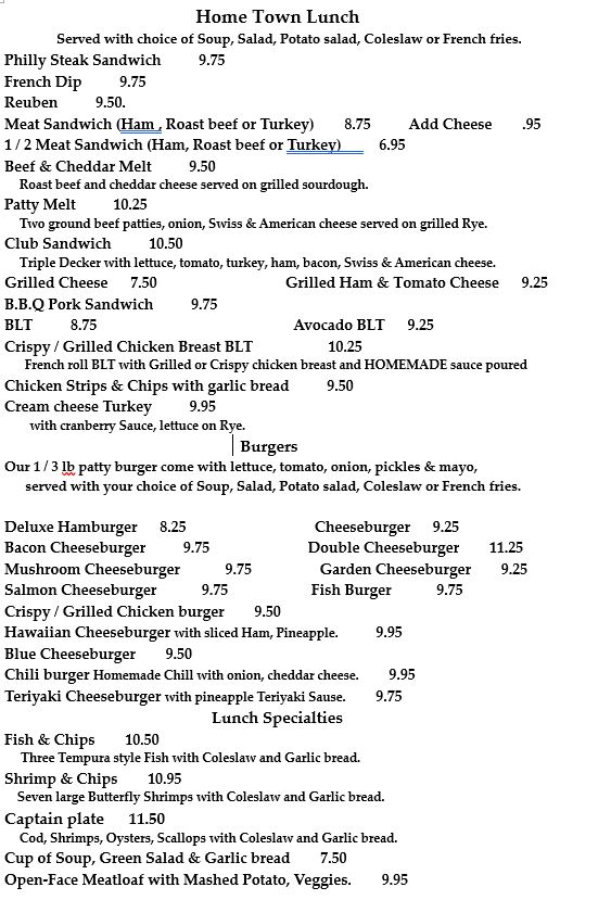 Home Town Lunch, Served with choice of Soup, Salad, Potato salad, Coleslaw or French fries.