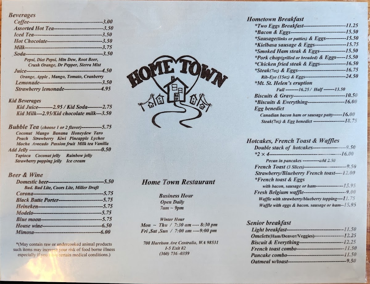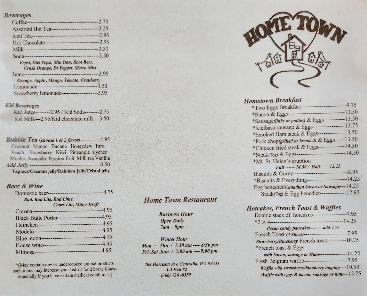 Welcome to Hometown Restaurant, located at 708 Harrison Ave in Centralia, WA. This charming eatery prides itself on offering a menu filled with home-style delights that cater to all appetites. Whether you’re in the mood for a hearty Home Town Lunch or indulging in a satisfying Home Town Dinner, there’s something here for everyone.