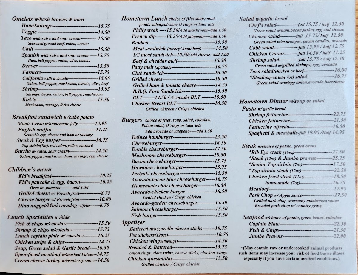 - Dinner Favorites: The Country Fried Steak and Top Sirloin Steak served with fresh veggies and choice of potato are standout selections.